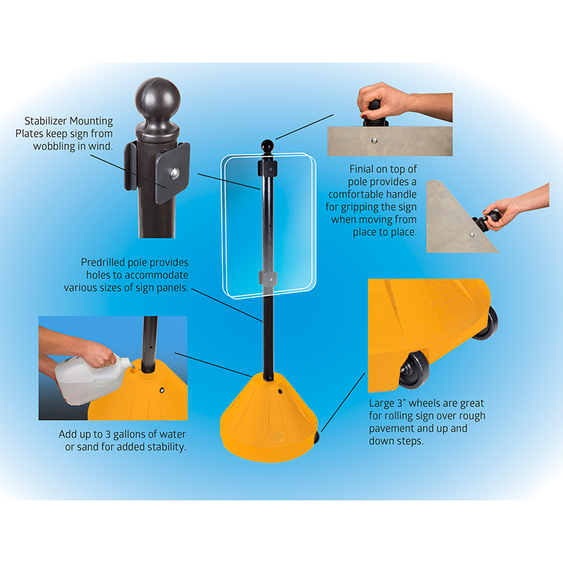 Move your sign in a cinch with our Cone-shaped Portable Roll 'n' Pole Sign Holder.