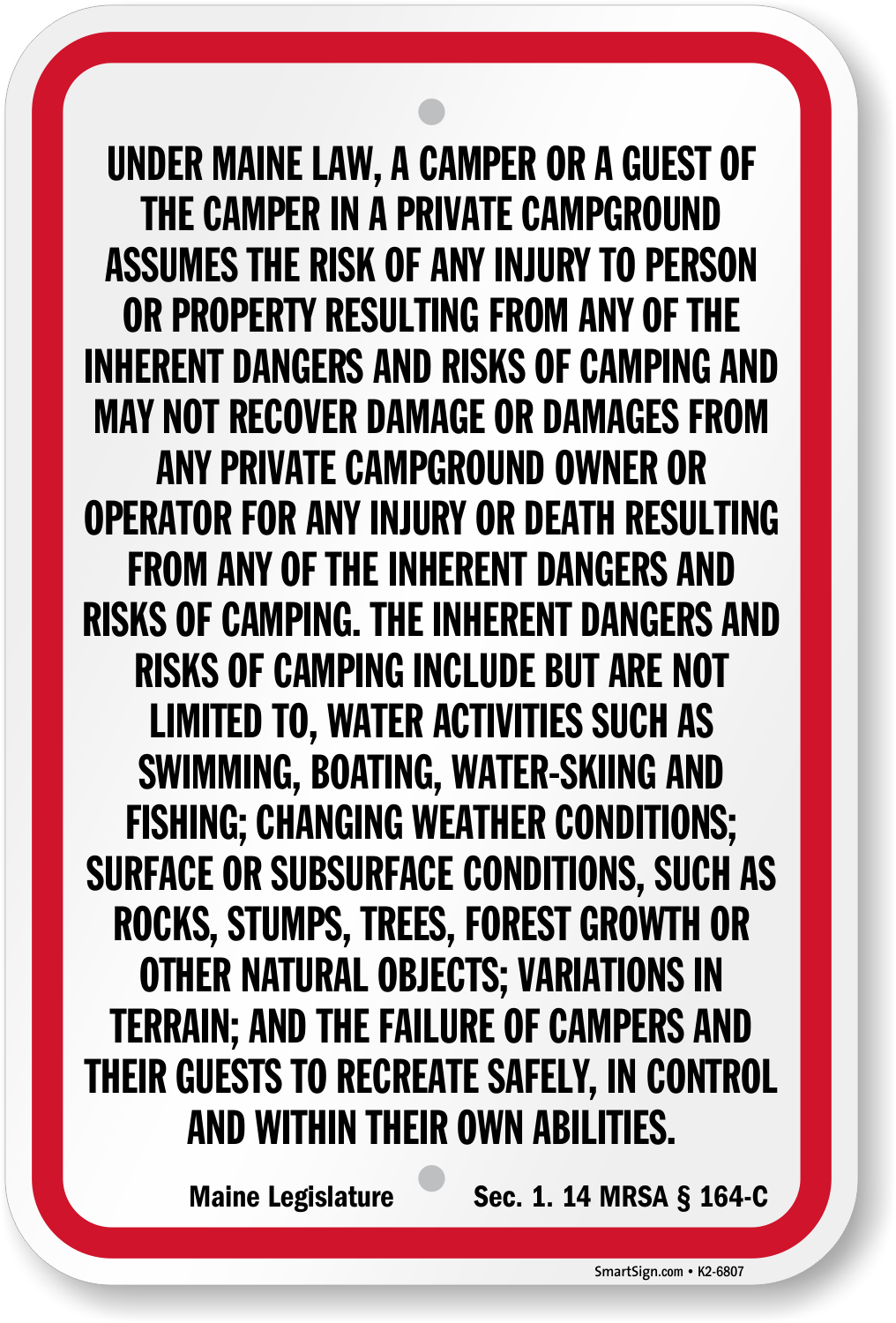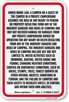Campground, Park & Guide Sign: Under Maine Law Campground Liability Sign (Maine Legislature Sec. 1. 14 MRSA §164-C ) K2-6807 Learn More...